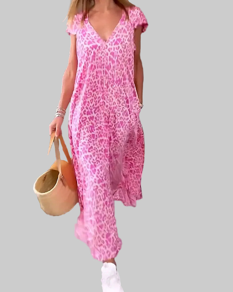Robe longue col V en imprimé à manches courtes
